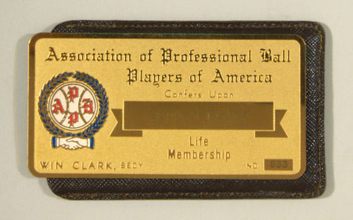 Johnny Pesky Association of Professional Ball Players of America Membership Card. Original brass member card as presented to Pesky for a life membership to the organization. Flawless original condition including its original sheath: NM
