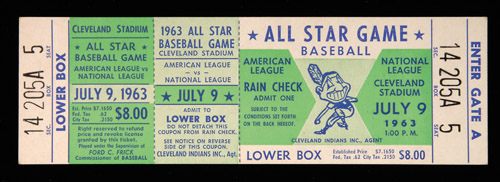 Description:1963 All-Star Game (at Cleveland) full ticket. Rare original unused ticket issued for game played at Cleveland Stadium which was won by the National League and MVP Willie Mays. Hint of wear at extreme corners with center perforation remaining intact but a bit "soft": EX/MT-NM