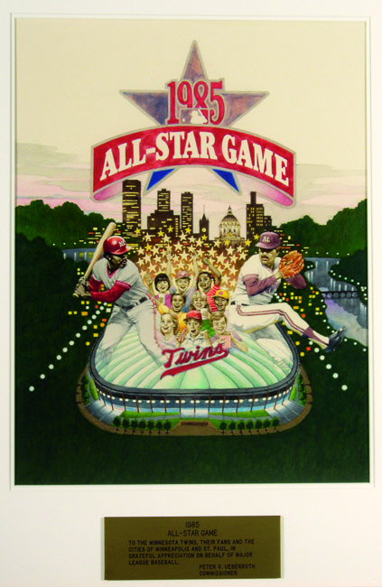 Description:1985 All-Star Game program cover original artwork. Original large format watercolor and pencil artwork as rendered to serve as the cover for the game which was played in Minnesota. Tastefully matted and framed for display in gallery style (just under 23"x28" overall) with affixed metal placard which reads, "1985 All-Star Game, To the Minnesota Twins, their fans and the cities of Minneapolis and St. Paul, in grateful appreciation on behalf of Major League Baseball. Peter V. Ueberroth, Commissioner." No visible wear: NM