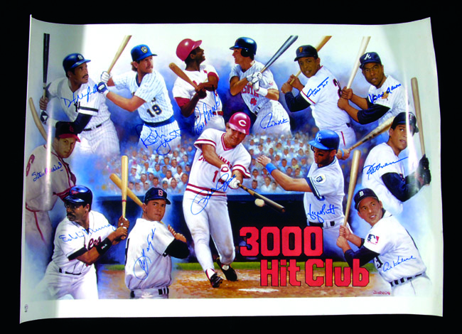 Description:3,000 Hit Club autographed poster. Large format print has been signed by (13) incl. Mays, Aaron, Yount, Brett, Musial, Rose, Yastrzemski, Kaline, Brock, Carew, Molitor, and Winfield. Blue marker signatures rate 8-9/10 out of 10. Measures 25"x37" and has been tastefully matted and framed to slightly larger dimensions for display. Includes auction LOA from JSA: NM