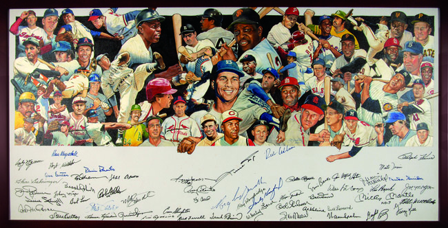 Description:Exceptional Baseball Hall of Famers autographed original oil painting by Craig Pursley. Large format original oil on canvas with exceptionally well done collage of player likenesses filling the upper portion, all shown in familiar poses and affiliated uniforms. Each has signed in the large lower white border with (54) signatures total incl. Mickey Mantle (No.7 inscribed), Roy Campanella, Willie Mays, Stan Musial, Sandy Koufax, Don Drysdale, Hank Aaron, Charles Gehringer, Mike Schmidt, Ernie Banks, Buck Leonard, Eddie Mathews, Al Kaline, and others. Marker signatures rate 7/8 to 9 out of 10. Gallery style framed to 29.5"x53" overall with dramatic display value and signed by the artist within (dated 2001). One of the best paintings we have encountered within the sports genre with regard to quality and content. Includes auction LOA from JSA and numerous photos of some of the players at time(s) of signing: NM