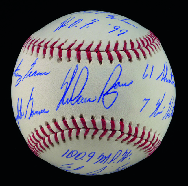 Description:Nolan Ryan stat inscribed single signed baseball. Rawlings B.Selig OML baseball has been signed on the sweetspot by Ryan in blue ink rating 9 out of 10. In addition, Ryan has hand inscribed (9) career related stats with all ideally positioned for display. Includes auction LOA from JSA and has Ryan Foundation and MLB authentication holograms affixed: NM-MT
