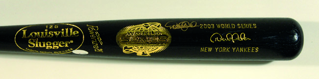 Description:Derek Jeter autographed 2003 World Series commemorative baseball bat. Full sized Louisville Slugger 125 model bat with Jeter facsimile signature and "2003 World Series New York Yankees" gold foil stamped into the barrel along with 03 World Series logo. Signed in gold paint pen "Derek Jeter" rating 9 out of 10 in ideal position for display. Includes COA from Steiner Sports and has Steiner and MLB Authentication holograms affixed. This was not a Steiner released product and was signed specifically at the request of our consignor: NM-MT