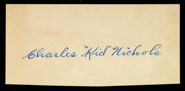 Charles "Kid" Nichols autograph. Bold blue ink full name signature rating 8 out of 10 appears on paper slip measuring just under 2.5"x5". Includes auction LOA from JSA: EX/MT-NM