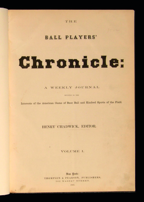 Description:1867 "The Ball Players' Chronicle" Volume 1 (hard bound). Exceedingly rare compilation representing the first (30) issues of this important work which was the first baseball periodical as published in 1867 by Thompson & Pearson and edited by Henry Chadwick. Issued between June and December, each issue is filled with boxscores, game summaries, and general historical record of baseball in the period. One of the most comprehensive references available and almost never seen in this complete form. Relatively clean with some minor toning/spotting to a portion of interior pages and some rips/tears on a few pages have been professionally repaired. Tastefully bound in more recent times in green boards with gilt lettered edge (measures approx. 11"x15"): Overall EX/MT