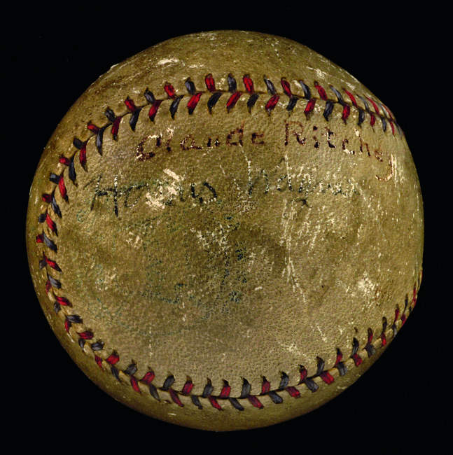 Description:Early Honus Wagner and Claude Ritchey autographed baseball c.1900s-10s. Red and blue stitched baseball has been signed at top of a side panel, "Claude Ritchey" with his Pittsburgh Pirates teammate "Honus Wagner" just below. Fountain pen signatures rate 3-3/4 (Wagner) to 5-5/6 (Ritchey) out of 10. The ball is soiled throughout with surface wear and appears to have been used. Stampings have largely faded but it can be discerned that it is likely a Reach brand Official American League example dating c.1900s-10s. Uncommonly early for a signed baseball of any type and includes letter of provenance which traces history through the Ritchey family. Includes auction LOA from JSA: GD-VG