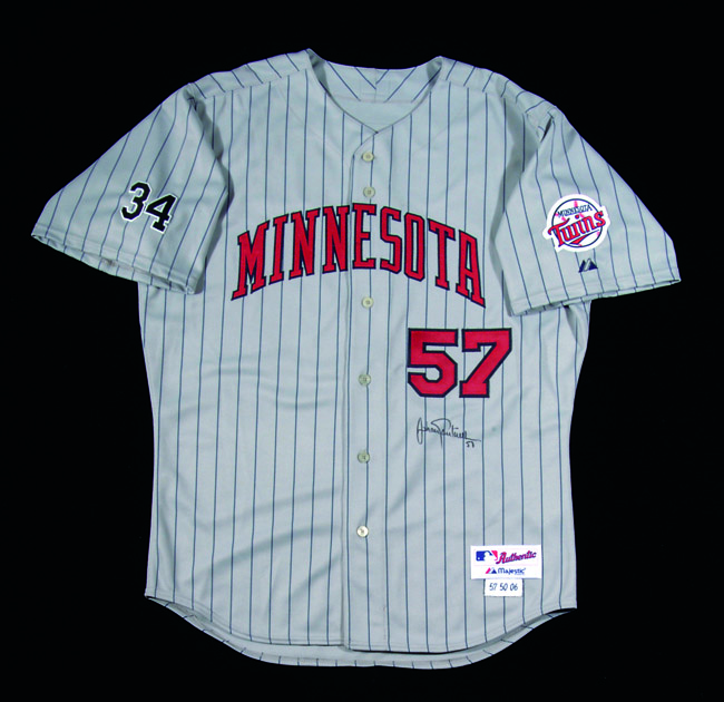 Description:2006 Johan Santana autographed Minnesota Twins professional model road jersey. Gray pinstriped jersey has "Minnesota" block lettered across the front with player number "57" below. Number also appears on back below "Santana" nameplate. A team logo patch appears on left sleeve; "34" memorial patch is on right as worn following the death of Kirby Puckett. "Majestic" manufacturer's tag appears on front tail along with "57 50 06" embroidered strip tag. Properly coded wash tag inside and an affixed MLB authentication hologram confirms that the jersey is "team issued." Signed on the front in black marker rating 8/9 out of 10. Very little, if any, usage/wash wear. Includes LOA from Hunt Auctions and auction LOA from JSA: EX/MT