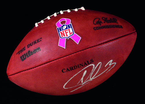 Description:Carson Palmer autographed official NFL Breast Cancer Awareness authentic Arizona Cardinals football. Palmer signed the ball in silver marker. Includes NFL Auction COA from PSA/DNA with matching serial number sticker affixed: NM