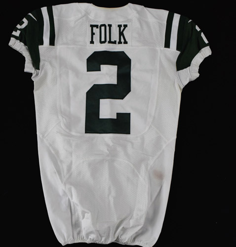 Description:Nick Folk game worn New York Jets jersey (10/5/2014, Breast Cancer Awareness). Nike size 42 Jets #2 Nick Folk jersey worn by Folk during game against the Chargers. Proper On Field "Skill" position tagging is inside the collar. Includes NFL Auction COA from PSA/DNA with matching serial number sticker affixed. Displays light use with sweat staining around the collar: EX