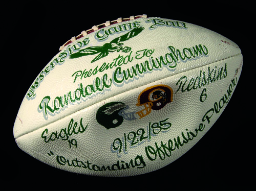 Description:Randall Cunningham September 22, 1985 Presentational Game Ball. Official P.Tagliabue NFL football as presented to Cunningham for his performance on the Philadelphia Eagles in a victory against the Redskins by a score of 19-6. Two side panels feature hand painted surfaces denoting the presentation to Cunningham for offensive player of the game. Cunningham led the Eagles to victory with a TD pass and 60 yards rushing. Light general wear to the ball surface from apparent game use. Ball is partially deflated: EX
