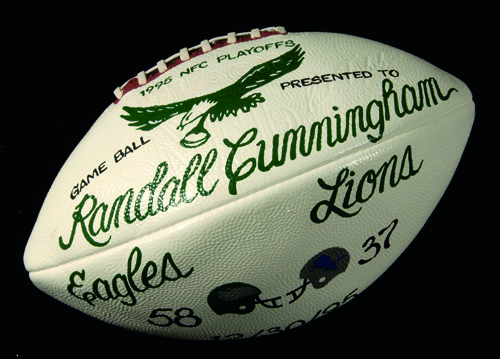 Description:Randall Cunningham December 30, 1995 NFC Playoffs Presentational Game Ball. Official P.Tagliabue NFL football as presented to Cunningham for his performance on the Philadelphia Eagles in a playoff victory against the Lions by a score of 58-37. Two side panels feature hand painted surfaces denoting the presentation to Cunningham likely as a symbol of thanks for his meaning to the team after the playoff victory. Light general wear to the ball surface: EX-MT