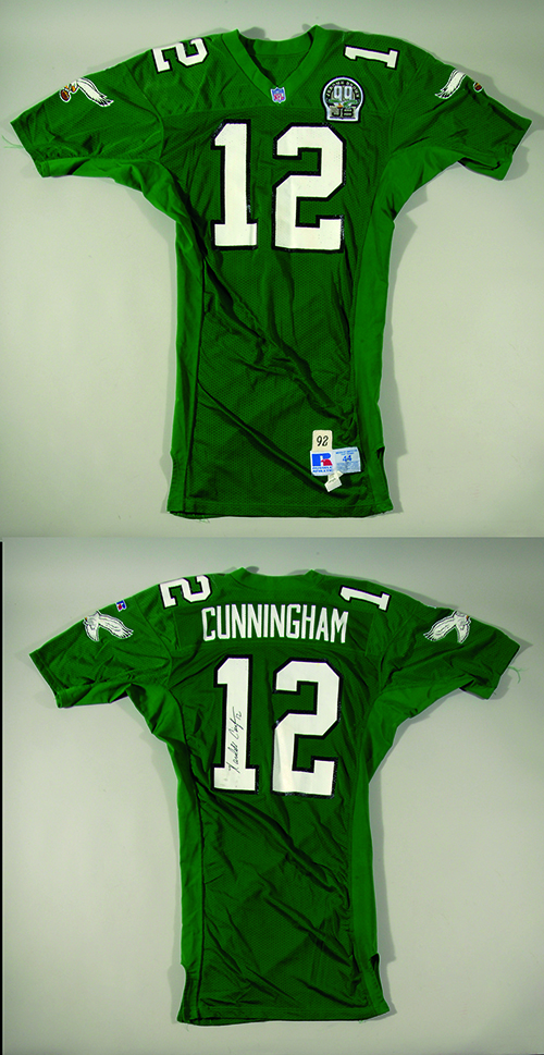 Description:1992 Randall Cunningham Philadelphia Eagles game used home jersey. Classic kelly green mesh jersey with "Cunningham" nameplate affixed to the back having uniform #12 on front, back, and both shoulders. Desirable Jerome Brown 99 memorial patch affixed to shirt front with proper Russell Athletic tagging near base of tail along with "92" year tag and 6" extra length. Light evident use throughout with no visible repairs or alterations. Signed by Cunningham on the back in black sharpie. Includes LOA from Hunt Auctions (jersey) and auction LOA from JSA (autograph): EX-MT