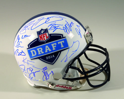 Description:2014 NFL Draft Picks multi-signed ProLine helmet. Riddell full size VSR4 2014 Draft helmet signed by (28) including Sammy Watkins, Blake Bortles, Johnny Manziel, Jadeveon Clowney, Khalil Mack, Mike Evans, Ryan Shazier, Brandin Cooks, and others. Includes NFL Auction COA from PSA/DNA with matching serial number sticker affixed: NM