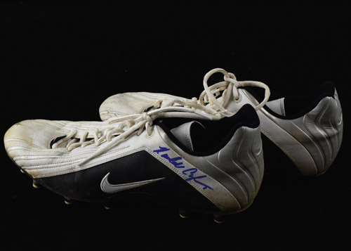 Description:2001 Randall Cunningham Baltimore Ravens game worn football cleats. Pair of Nike Football professional model cleats as worn by Cunningham with the Ravens during the 2001 season. Evident use throughout with vintage "1" uniform number written on back of heels. Signed by Cunningham in blue sharpie. Includes LOA from Hunt Auctions (cleats) and auction LOA from JSA (autograph): EX