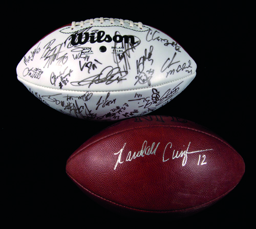 Description:Randall Cunningham autographed Final NFL game used football along with 2001 Baltimore Ravens team autographed football. Official P.Tagliabue Wilson NFL football having been signed by Cunningham in silver paint pen on side panel. Ball was used in Cunningham's final game played against the Steelers on Nov. 4, 2001 with period ink inscription as such on side panel of ball. The lot also includes NFL Wilson white panel football signed by the 2001 Ravens team including Ray Lewis. Includes auction LOA from JSA: EX