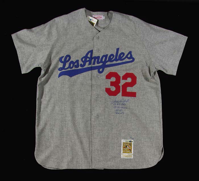 Description:Sandy Koufax autographed Los Angeles Dodgers replica jersey. Grey flannel Mitchell & Ness Dodgers jersey signed by Koufax across the front in blue sharpie along with four career statistical inscriptions. Numbered 20/32 with Onoine Authentics sticker affixed. Includes auction LOA from JSA: NM