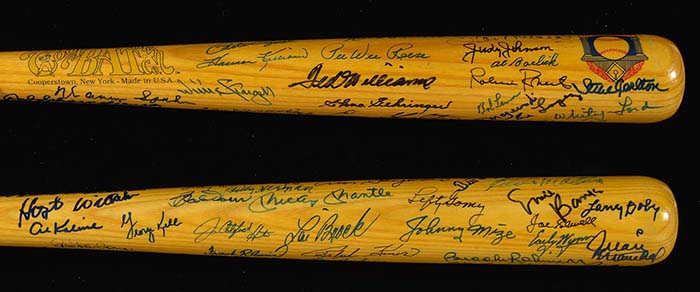 Description:Superb Hall of Famer autographed baseball bat (50+ signatures). Cooperstown Bat Co. Hall of Fame commemorative baseball bat signed by an incredible array of over (50) players. Signatures include Mantle, T.Williams, Musial, Reese, Aaron, Stargell, Killebrew, Spahn, Ford, Mize, Banks, Doby, Brock, F.Robinson, Irvin, Feller, Hunter, Snider, McCovey, Rose, and Carlton. Signatures range from 8-10 out of 10. Very fine example on which each signature was personally obtained by the consignor. Includes auction LOA from JSA: NM