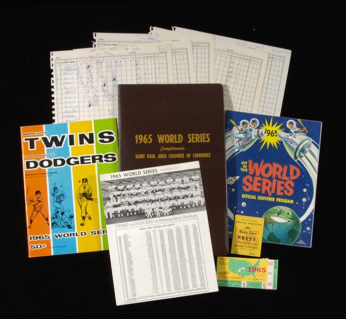 Description:1965 Dodgers vs. Twins World Series Herb Carneal scoring sheets with related material. Original scoring sheets (8.5"x10.5") as filled out by Carneal during his broadcasts which took place in either Minnesota or Los Angeles. Total of (6) double sided pages represent (5) games (numbers 1, 2, 3, 5, and 7) and each is done with noteworthy attention to detail. Among these are (3) which featured Sandy Koufax who threw a pair of shutouts including the clinching Game (7) in which he struck out (10) batters. Mild corner/edge and handling wear; pair of World Series programs (1 of each variety issued) remaining in high grade with limited wear; paper stock scorecard (EX/MT); Game (5) ticket stub; Press Headquarters ticket stub; Saint Paul Chamber of Commerce 1965 World Series folio filled with area related information. Includes letter of provenance from the Carneal Family: EX-NM
