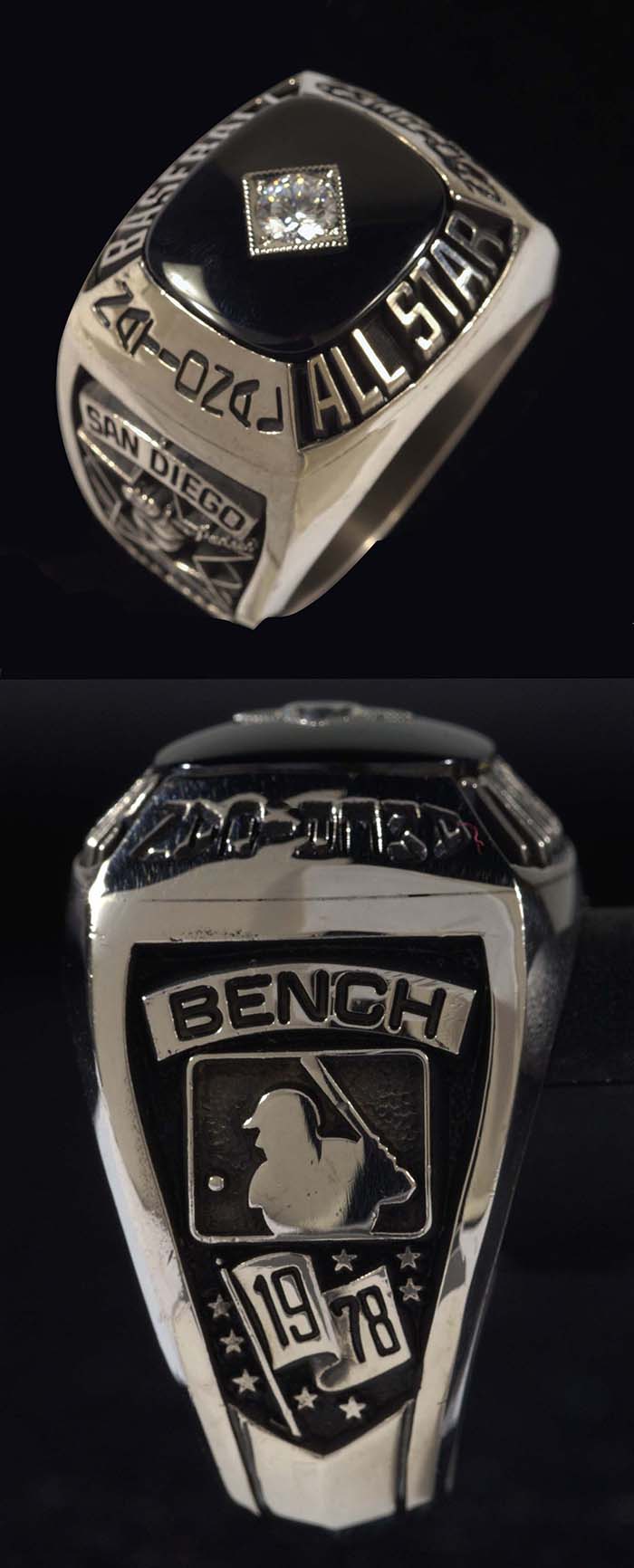 Description:Johnny Bench 1978 All-Star Game ring. Original ring as presented to Bench for his participation in the 1978 All-Star Game played in San Diego. "Baseball All-Star" lettering on top of ring along with "National/American" surrounding a black field with inset stone. One side panel displays "Bench" above MLB logo with the other having Padres related decor. Marked "LGB P1" on interior ring band: NM