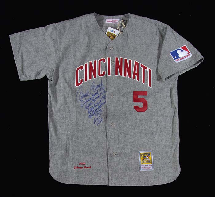 Description:Johnny Bench autographed Cincinnati Reds replica jersey with unique career statistical inscriptions. Fine quality Mitchell & Ness Cincinnati Red 1969 road flannel style jersey signed by Bench on the front in blue sharpie. Bench has included (5) statistical inscriptions: Gehrig Award 1975, Ruth Award 1976, Hutch Award 1987, Mel Ott Award 70 & 72, and ACT 1999. Includes auction LOA from JSA: NM-MT