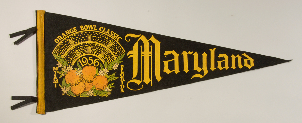 1956 Maryland Orange Bowl pennant. Full sized pennant with choice graphic has a touch of light wear and pinholes from mounting: EX
