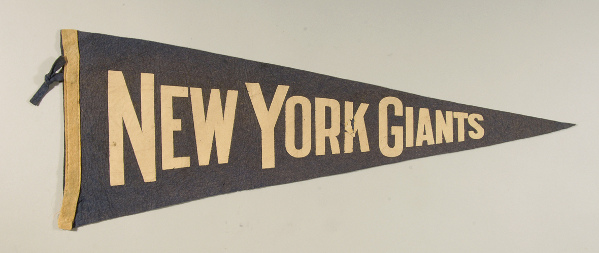 New York Giants souvenir pennant c.1930s. Full size blue pennant with white team name across the front. Has some handling wear and age fading with pinholes at corners and missing one set of tassels: GD-VG
