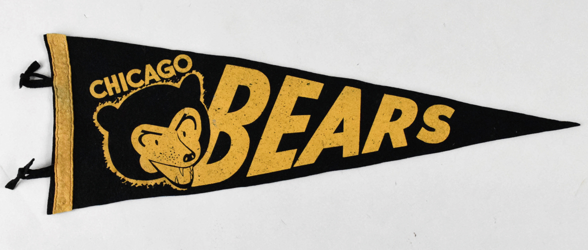 Description:Chicago Bear souvenir pennant c.1920-30s. Very uncommon 3/4 size variant with Bears mascot graphic at left end of black heavy gauge pennant with block letter team name across the front. Retains its original tassels with tiny pinholes at corners and tip area: EX
