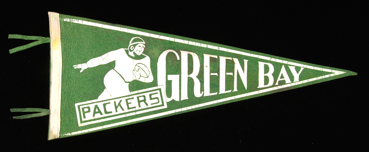 Description:Rare Green Bay Packers souvenir pennant c.1930s. Full size green pennant with white player graphic at left end and team name across the front in atractive stylized lettering. Expected crazing to the border and lettering areas with small pinholes to corners and tip. Some minor red and yellow staining is found in a few areas of the front: VG-EX