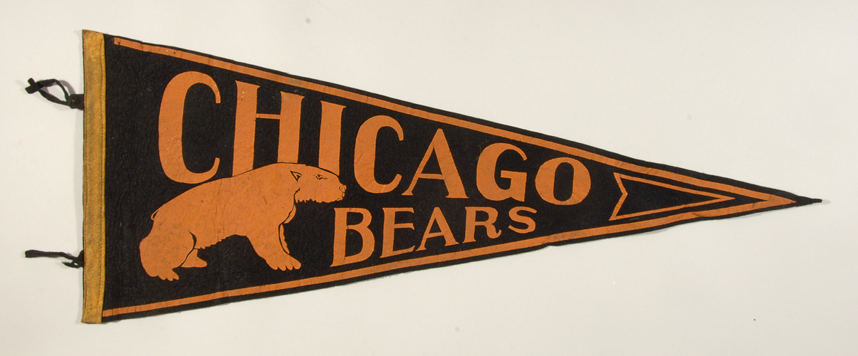 Chicago Bears souvenir pennant c.1930-40s. Full size black pennant with stylized Bears logo and team name across the front. Retains original tassels with small pinholes at corners and tip area: EX