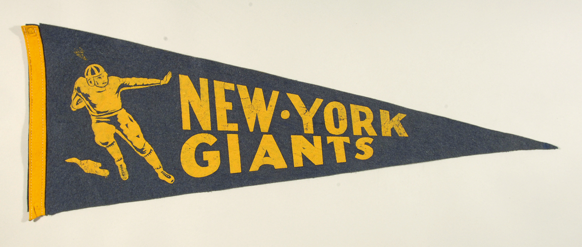 Description:New York Giants souvenir pennant c.1940s. Very early full size navy blue pennant displaying an early uniformed player at left end with team name in yellow block lettering across the front. Small pinholes at corners and tip area. First example of this tough early Giants pennant we have encountered: EX