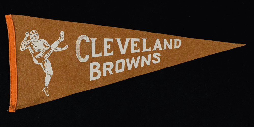 Cleveland Browns souvenir pennant c.1940s. Light brown full size pennant with player graphic at left end. "C" in Cleveland has a period blue ink line: VG