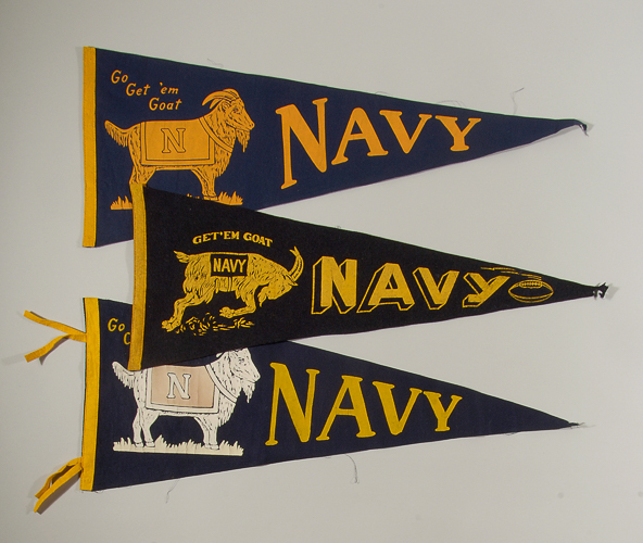 Description:Lot of (3) Navy "Go Get 'em Goat" pennants c.1940s-50s. Trio of full sized felt pennants with screened on titling and graphics. All have pinholes from mounting and (2) have some very light wear which largely takes the form of frayed tip. The other has some more pronounced damage to pointed end: VG/EX-EX/MT
