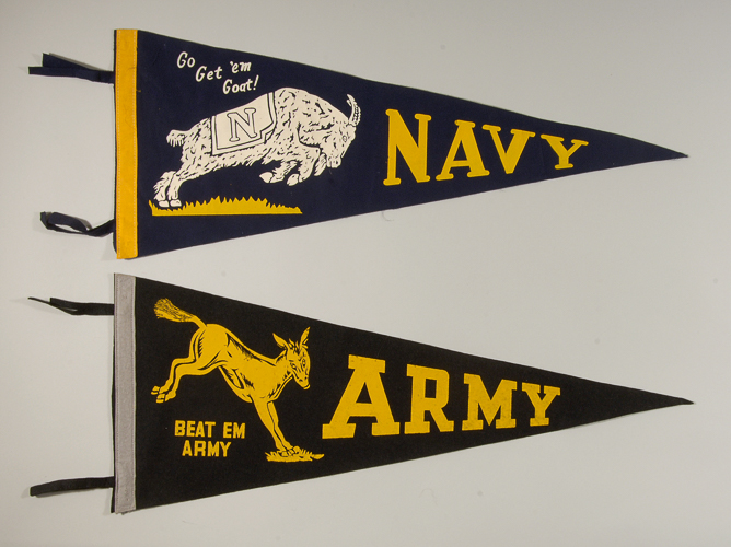 Vintage Army and Navy pennants c.1950s. Pair of full sized pennants with screened on titling and graphics. Little mentionable wear aside from minute pinholes from mounting: EX/MT