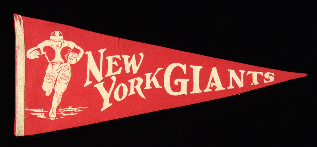 Description:New York Giants souvenir pennant c.1944. Full size red pennant with player graphic at left end and team name in script across the front. Small pinholes at corners and tip area along with some surface abrasions to the white border at left edge: VG-EX