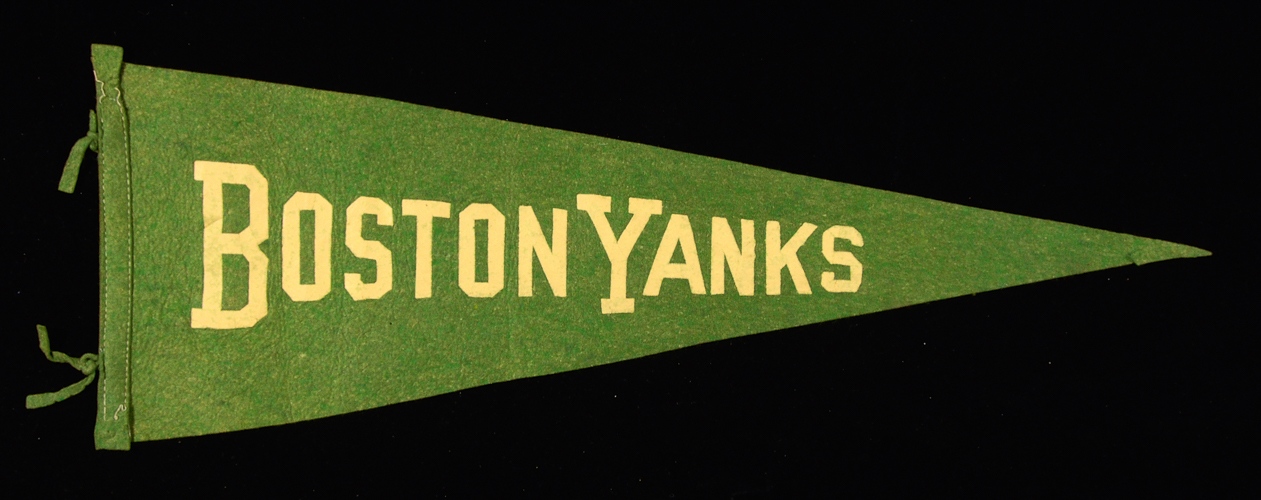 Description:Boston Yanks souvenir pennant c.1944-48. Full size green pennant having team name across the front in white block lettering. Retains original tassels with small pinholes at corners and tip area: EX