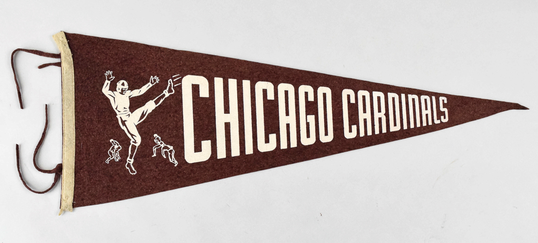 Chicago Cardinals souvenir pennant c.1940s. Full size maroon pennant with player graphic at left end and team name across the front in white block lettering. Retains original tassels with small pinholes at corners and tip area: VG-EX