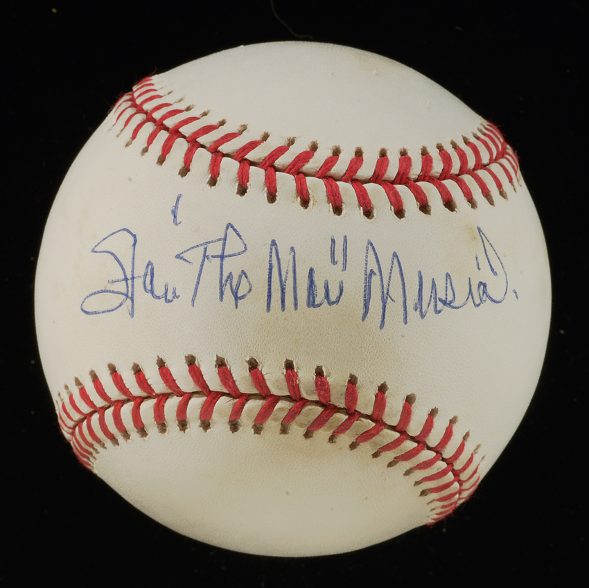Description:Stan 'The Man" Musial single signed baseball. L.Coleman NL ball signed by Musial on sweet spot along with trademark nickname inscription. Signature rates 9 out of 10, ball itself has some scattered age toning spots of relatively minor grade. Includes auction LOA from JSA: Ball: EX, Signature: NM