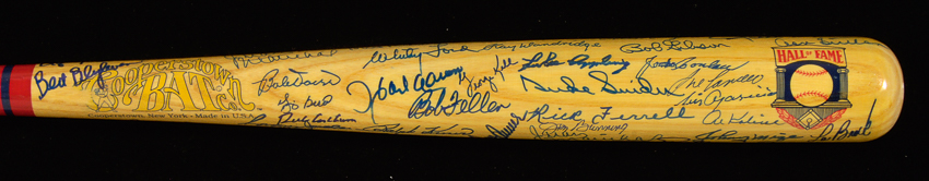 Description:Hall of Fame bat autographed by (60+) Inductees. Cooperstown Bat Co. full sized bat with "Hall of Fame" logo decal on the barrel has been signed throughout by a host of Inductees. Notables incl. Ripken, Koufax, Mays, Ashburn, Stargell, Berra, Aaron, Conlan, Kaline, Mize, Seaver, Berra, Drysdale, Reese, Leonard, Clemens, Ford, Yastrzemski, Mathews, Gomez, Hunter, and others. Marker signatures rate 8 to 8/9 out of 10 and include a host of names not typically seen on such pieces. Includes auction LOA from JSA: NM