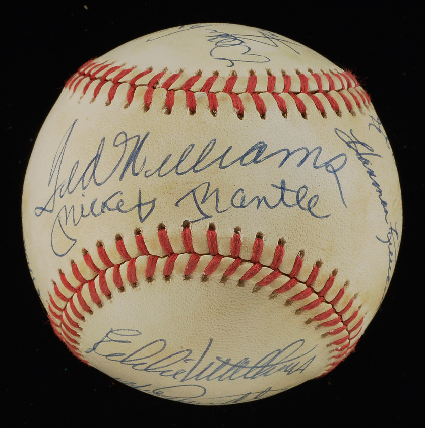 Description:500 Home Run Club autographed baseball (14 signatures). Rawlings W.White ONL baseball has been signed by Mantle, Williams, Aaron, Mays, Bonds, Palmiero, Jackson, McCovey, Mathews, Schmidt, Murray, Banks, Killebrew, and Robinson. Ink signatures rate 8-8/9 out of 10. Ball displays mild scattered toning. Includes auction LOA from JSA: EX/MT-NM