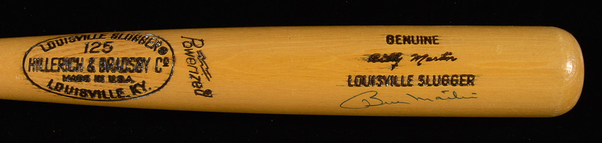 Billy Martin autographed baseball bat. Louisville Slugger 125 model M110 bat done in similar style to that which he would have used has been signed, "Billy Martin." Blue marker signature rates 8 out of 10. Includes auction LOA from JSA: NM