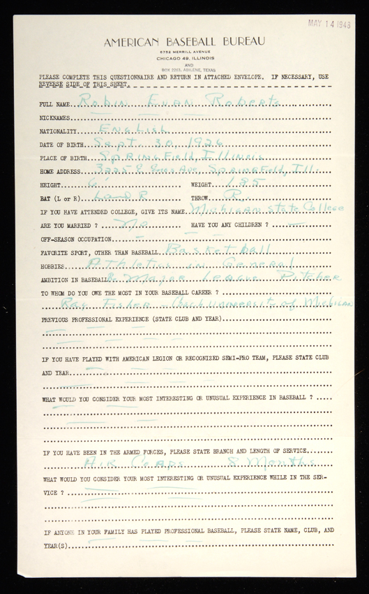 Description:1948 Robin Roberts handwritten questionnaire. Legal sized "American Baseball Bureau" questionnaire with May 14, 1948 date stamped at upper corner was filled out in the period by the noted Hall of Famer less than a month before his debut with the Phillies. He has printed his full name "Robin Evan Roberts" at top and handwritten answers to a number of personal and baseball related questions with some choice content. Most notably, Roberts writes that his ambition in baseball is "Be Major League Pitcher." All done in ink rating 7/8-8 out of 10. Faint fold lines and a touch of light wear. Includes auction LOA from JSA: EX/MT
