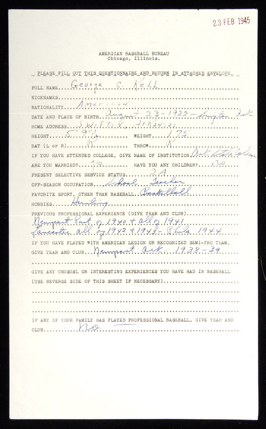 Description:1945 George Kell handwritten questionnaire. Legal sized "American Baseball Bureau" questionnaire has Feb. 23, 1945 date stamped at upper corner. Kell has printed his full name "George C Kell" at top and handwritten answers to a number of personal and baseball related questions with some choice content. Most notably, he writes of his former baseball experience. All done in ink rating 8/9 out of 10. Faint fold lines and a touch of light wear. Includes auction LOA from JSA: EX/MT