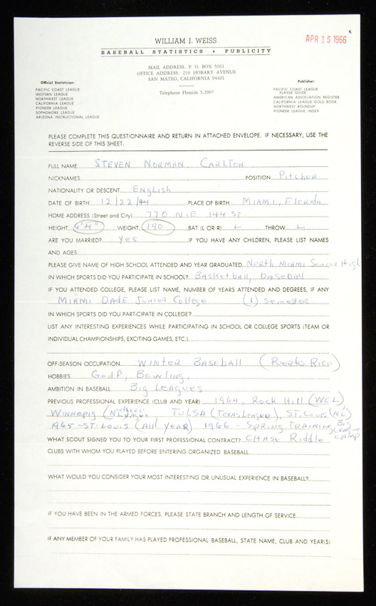 Description:1966 Steve Carlton handwritten questionnaire. Legal sized questionnaire has April 15, 1966 date stamped at upper corner. Carlton has handwritten his full name "Steven Norman Carlton" at top and handwritten answers to a number of personal and baseball related questions with some choice content. Most notably, he relates his ambitions to make the Big Leagues and lists a number teams he had previously played for in several Minor Leagues. All done in ink rating 8/9 out of 10. Faint fold lines and a touch of light wear. Includes auction LOA from JSA: EX/MT