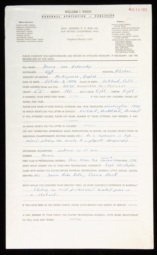 Description:1972 Dennis Eckersley handwritten questionnaire. Legal sized questionnaire has Aug. 12, 1972 date stamped at upper corner. Eckersley has handwritten his full name "Dennis Lee Eckersley" at top and handwritten answers to a number of personal and baseball related questions with some choice content. Most notably, he relates his greatest thrill of pitching a shutout in his first professional game. All done in ink rating 8 out of 10. Faint fold lines and a touch of light wear. Includes auction LOA from JSA: EX/MT