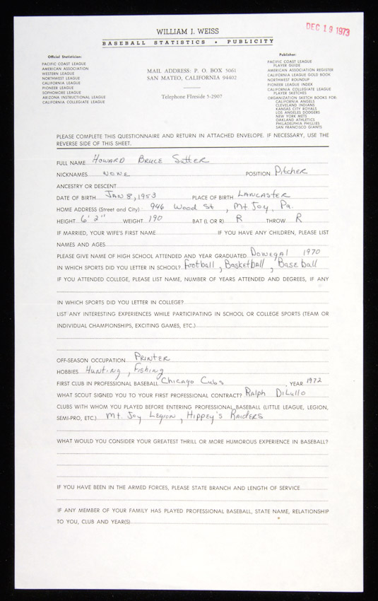 Description:1973 Bruce Sutter handwritten questionnaire. Legal sized questionnaire has Dec. 19, 1973 date stamped at upper corner. Sutter has printed his full name "Howard Bruce Sutter" at top and handwritten answers to a number of personal and baseball related questions. All done in ink rating 7/8 out of 10. Faint fold lines and a touch of light wear. Includes auction LOA from JSA: EX/MT