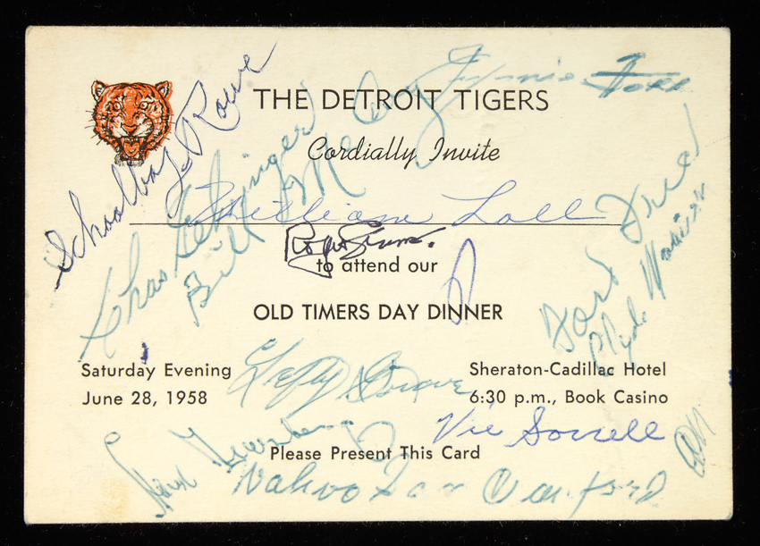 Description:1958 Detroit Tigers Old Timers Day invitation autographed by (21) incl. (9) Hall of Famers. Heavy stock 3.5"x5" invitation has been signed throughout the front and back by (21) incl. Ty Cobb, Jimmie Foxx, William Harridge, Sam Crawford, Mel Ott, Lefty Grove, Ford Frick, Schoolboy Rowe, Hank Greenberg, Goose Goslin, and others. Ink signatures rate 7-8 out of 10. Piece has some mild handling wear and a few ink marks and toning spots. Includes auction LOA from JSA: Invitation EX, Sigs. EX-NM