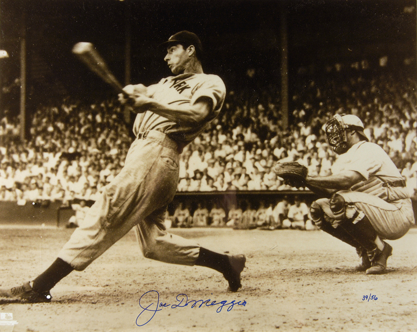 Description:Joe DiMaggio autographed large format limited edition photograph. Sepia toned 16"x20" photo has been signed "Joe DiMaggio" in marker rating 9/10 out of 10. Hand numbered "39/56" and framed for display to 24"x20" with descriptive placard. Includes auction LOA from JSA: NM