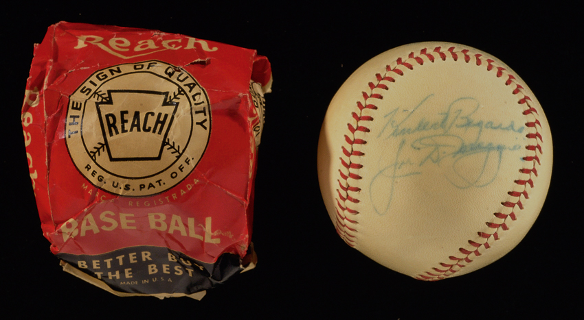 Description:Choice Joe DiMaggio vintage single signed baseball c.1950s. Reach W.Harridge Official American League baseball has been signed on the side panel, "Kindest Regards, Joe DiMaggio." The signature, done in ink, rates 7-7/8 out of 10. Ball displays light even toning with well defined stampings. Outstanding and early example. Includes original Reach bag (GD) and auction LOA from JSA: EX/MT-NM