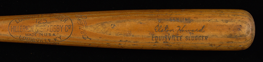 Description:Elston Howard professional model baseball bat c.1955-60. Louisville Slugger 125 model bat with Howard facsimile signature burned into the barrel measures 35" long and weighs 32.4oz. Model number "R16" is stamped in the knob. Usage and general surface wear throughout along with a series of dents and divots. An area of discoloration over repaired handle crack suggests that tape was removed. A desirable early career example from a key member of (6) Yankees Championship teams. Includes LOA from Hunt Auctions: EX