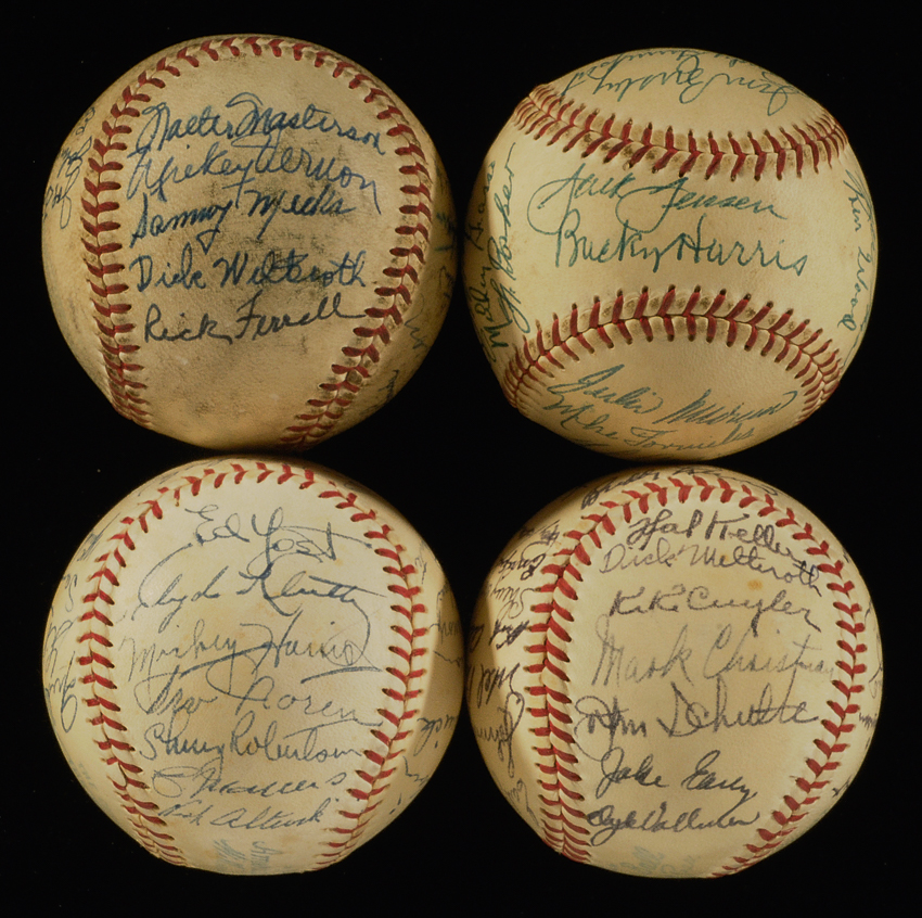 Description:1948-1952 Washington Senators team signed baseballs (4). Reach W.Harridge OAL baseballs incl. 1948 (mild soiling/use, faded stampings) signed by (20) incl. Wynn, Ferrell, and Vernon; 1949 (outstanding example) signed by (29) incl. HOFers Cuyler, Ferrell, Doerr, and Combs; 1951 signed by (27) incl. Harris, Altrock, and Vernon; and 1952 signed by (22) incl. Harris, Jensen, Vernon, and Altrock. Signatures generally rate 7/8-9 out of 10. Balls have lightly toned and retain bold stampings (unless noted). Includes auction LOA from JSA: EX/MT-NM